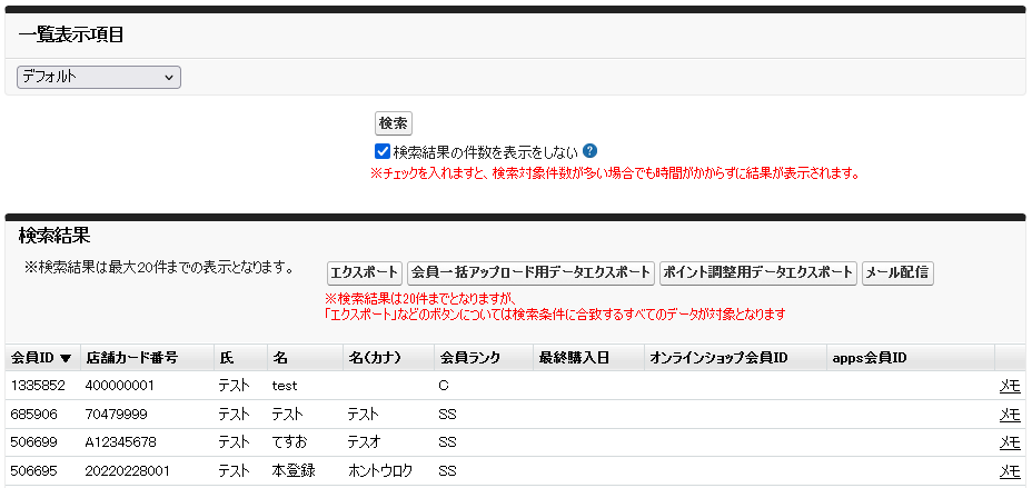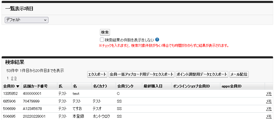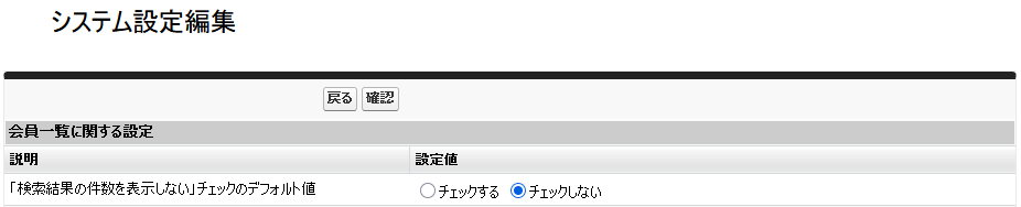 会員一覧画面の検索ボタンの下に「検索結果の件数を表示をしない」のチェックボックスを追加しました。