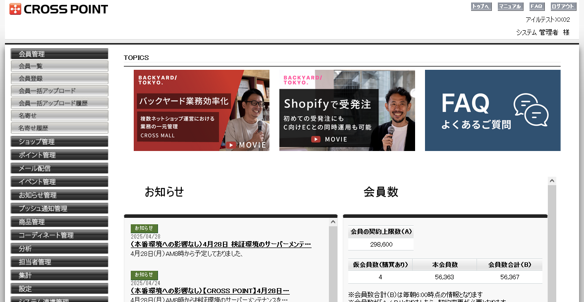 管理画面のトップ画面にTOPICSを掲載しております。